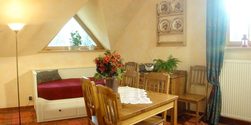 Posiada dwa apartamenty 4-5 osobowe i jeden apartament 2 osobowy (z możliwością wstawienia dodatkowego łóżka).