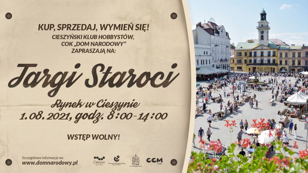 Cieszyński Klub Hobbystów i Cieszyński Ośrodek Kultury "Dom Narodowy" zaprasza na Cieszyńskie Targi Staroci, które odbędą się w niedzielę 1 sierpnia 2021 r. w godzinach 8.00-14.00 na cieszyńskim Rynku.