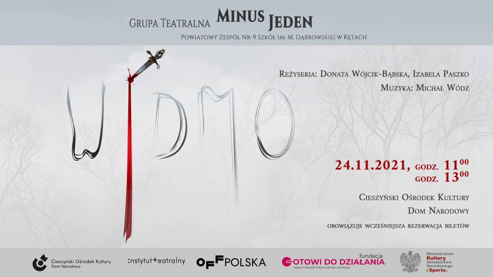 Cieszyński Ośrodek Kultury "Dom Narodowy" i Grupa Teatralna "Minus Jeden" z Powiatowego Zespołu Szkół im. M. Dąbrowskiej w Kętach zapraszają grupy szkolne na spektakl WIDMO!