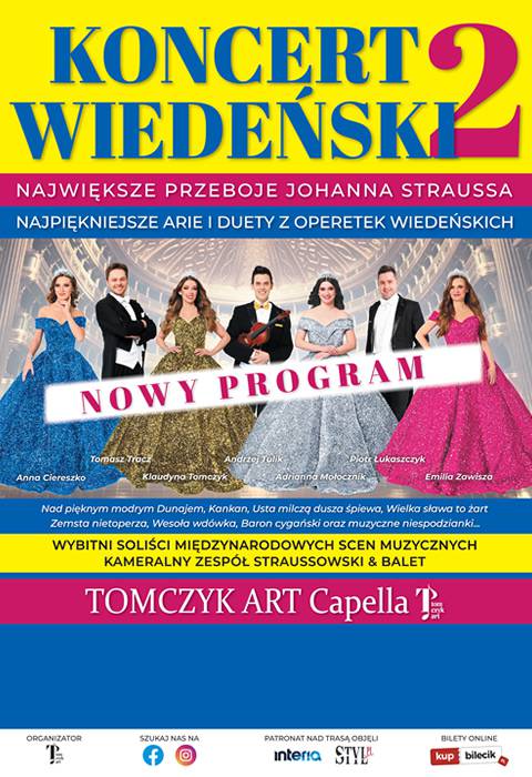 Wzruszają i bawią publikę od wielu lat, za każdym razem przyjmowani owacjami na stojąco! Tradycją stały się już coroczne Koncerty Wiedeńskie w wykonaniu tej niezwykłej grupy wspaniałych artystów. To połączenie klasycznej wiedeńskiej formy i kunsztu z młodością, wdziękiem, werwą i niespotykaną muzykalnością artystów wykonujących to jedyne w swoim rodzaju widowisko. Zabrzmią największe, ponadczasowe i wiecznie bliskie sercom melomanów przeboje króla walca - Johanna Straussa, nie zabraknie także popisowych arii z najsłynniejszych operetek "Zemsta nietoperza", "Baron cygański", "Wesoła wdówka", "Księżniczka czardasza" oraz "Kraina uśmiechu". Publiczność usłyszy m.in.: Walc "Nad pięknym modrym Dunajem", Arię Barinkaya "Wielka sława to żart", Duet wszech czasów "Usta milczą dusza śpiewa", polkę "Tritsch- Tratsch" oraz słynny "Marsz Radeckiego".