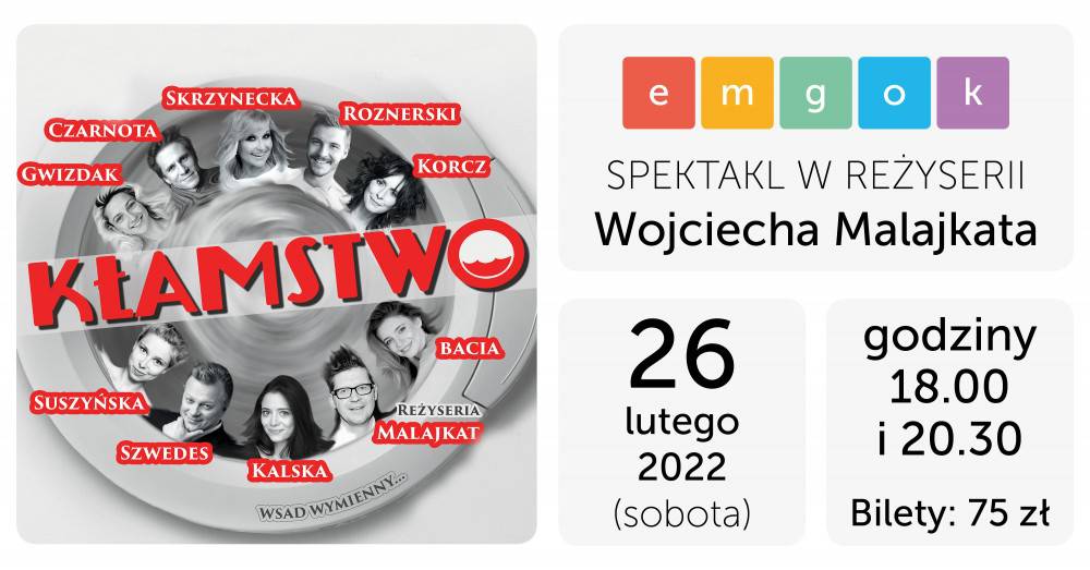 Miejsko-Gminny Ośrodek Kultury w Strumieniu zaprasza na spektakl w reżyserii Wojciecha Malajkata pt. „KŁAMSTWO”. Wydarzenie odbędzie się w sobotę 26 lutego 2022 r. w godzinach: 18:00 oraz dodatkowo 20:30. Bilety w cenie 75 zł do nabycia w kasie emgoku lub nastronie biletyna.pl KLIKAJĄC W TYM MIEJSCU.