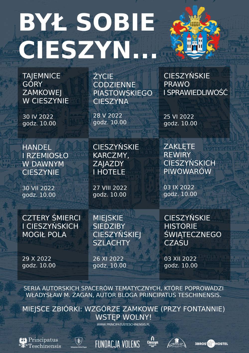 BYŁ SOBIE CIESZYN..., to seria autorskich spacerów tematycznych, kierowanych do fanów bloga Principatus Teschinensis, turystów, mieszkańców regionu oraz wszystkich tych, których interesuje historia Cieszyna, będącego przez wieki stolicą dawnego Księstwa Cieszyńskiego. Spacery poprowadzi Władysław M. Żagan, autor bloga.