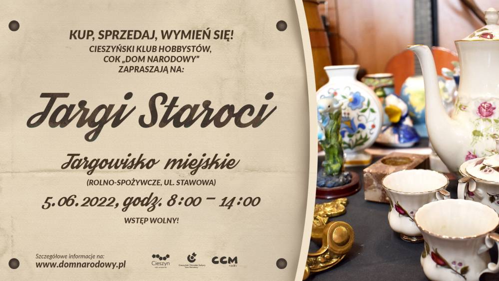 Cieszyński Ośrodek Kultury "Dom Narodowy" - COK i Cieszyński Klub Hobbystów zapraszają na Targi Staroci, które odbędą się w pierwszą niedzielę czerwca, 5.06.2022 r. w godzinach 8.00 - 14.00 NA TARGOWISKU MIEJSKIM (rolno-spożywczym, ul. Stawowa).