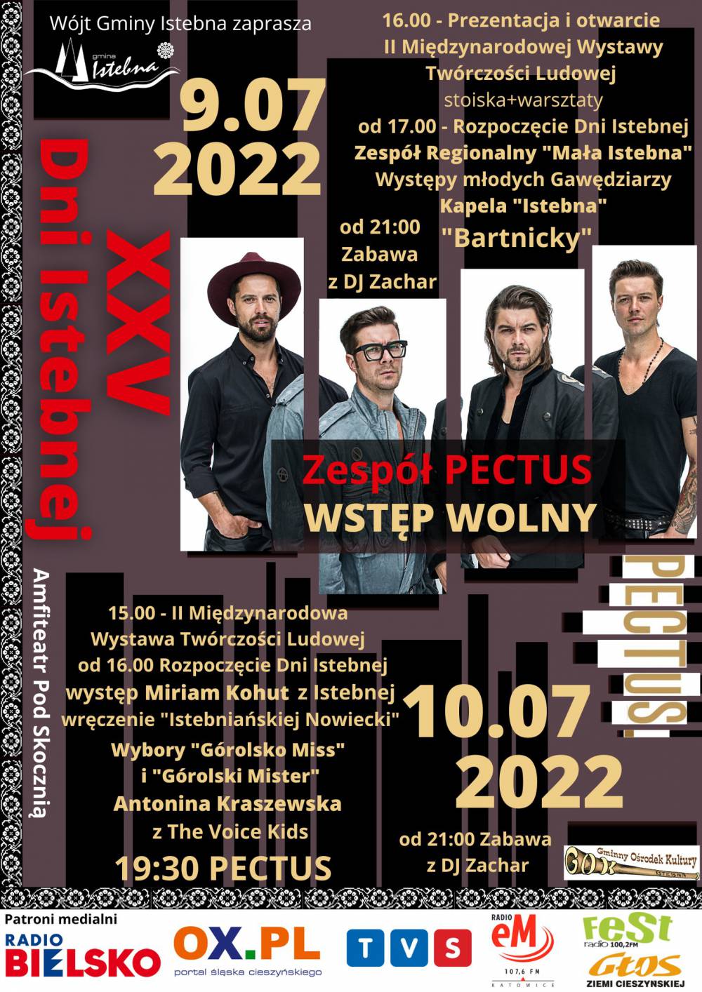 Dni Istebnej to jedna z największych imprez organizowanych przez Gminę Istebna i Gminny Ośrodek Kultury w Istebnej w trakcie roku. Tegoroczną edycję wydarzenia uświetni występ zespołu PECTUS i "Barnicky". Na scenie zobaczymy także zespół regionalny "Mała Istebna", Kapelę Istebna, Antoninę Kraszewską z The Voice Kids oraz Miriam Kohut z Istebnej. Na zakończenie każdego z dni czeka nas zabawa z DJ Zachar.