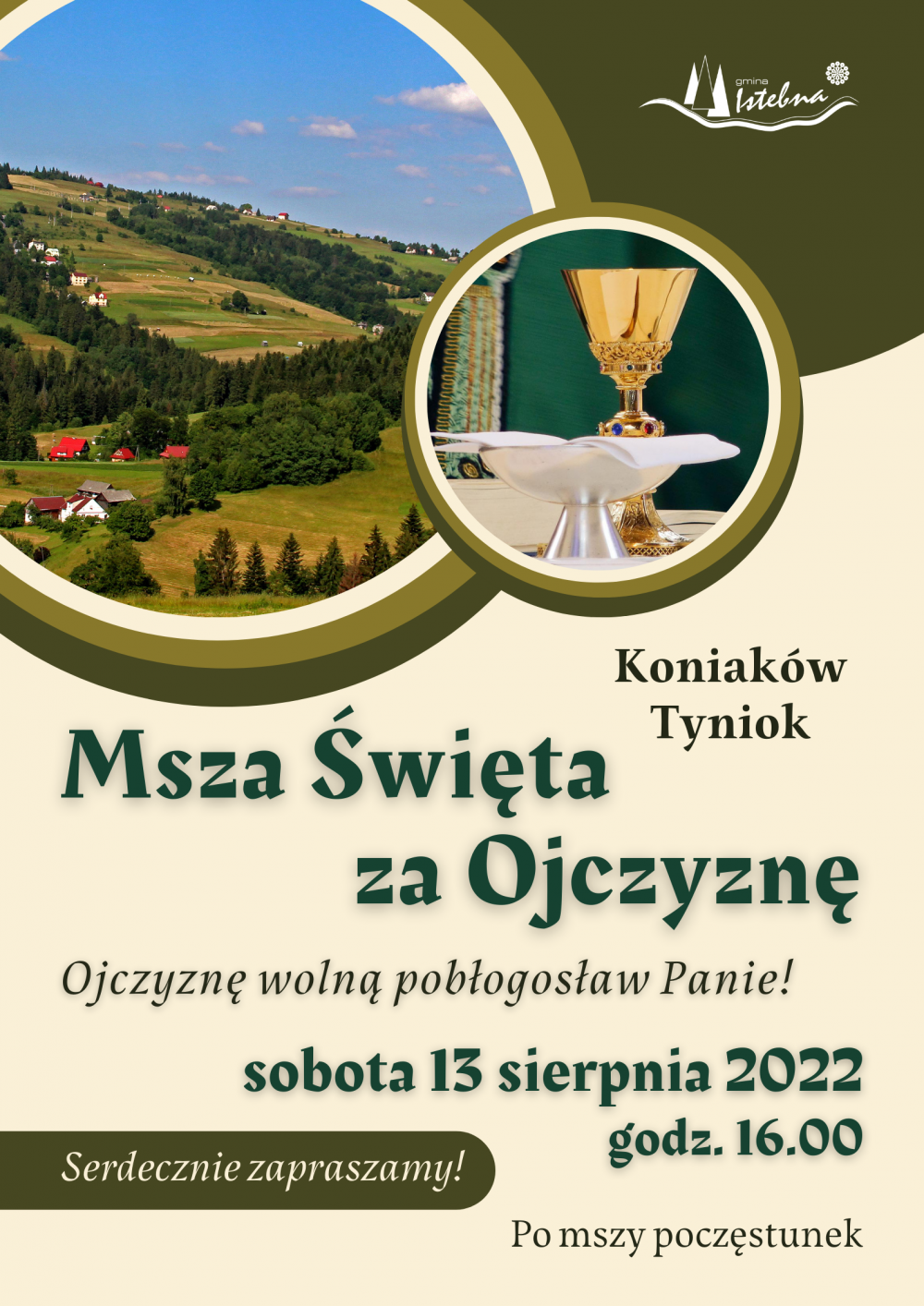 Zapraszamy na Mszę Świętą w intencji Ojczyzny, którą sprawował będzie Dziekan Dekanatu Istebniańskiego Ks. Tadeusz Pietrzyk w sobotę 13 sierpnia o godzinie 16.00 w Koniakowie na Tynioku. Po Mszy Świętej na uczestników czekać będzie poczęstunek.