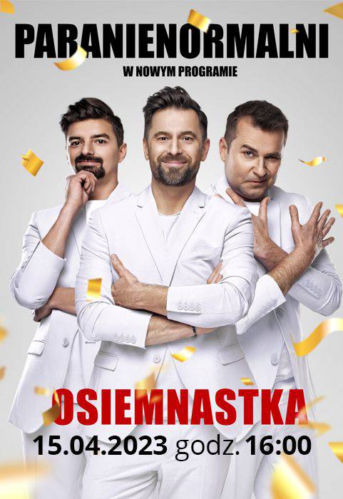 Zapraszamy do wspólnej celebracji, która potrwa cały 2023 rok! Blisko dwugodzinny spektakl, to przede wszystkim nowe skecze i postacie, które zabiorą widzów w podróż pełną humoru, komedii pomyłek i zaskakujących sytuacji. Skecze z najnowszego programu to wynik naszych wieloletnich obserwacji, tego co dzieje się w naszych domach, w zakładach pracy, telewizji, na ulicy, a nawet w kolejce na lotnisku. W krzywym zwierciadle widzowie zobaczą także własne odbicie, a niektórzy będą mieli również okazję wystąpić z nami na scenie, bo OSIEMNASTKA to skecze z udziałem publiczności. OSIEMNASTKA to projekt , który oderwie Was od szarej, przygnębiającej codzienności i przeniesie w paranienormalną, alternatywną rzeczywistość. Na scenie już pełnoletni: Michał Paszczyk, Robert Motyka i Jarosław Pająk!