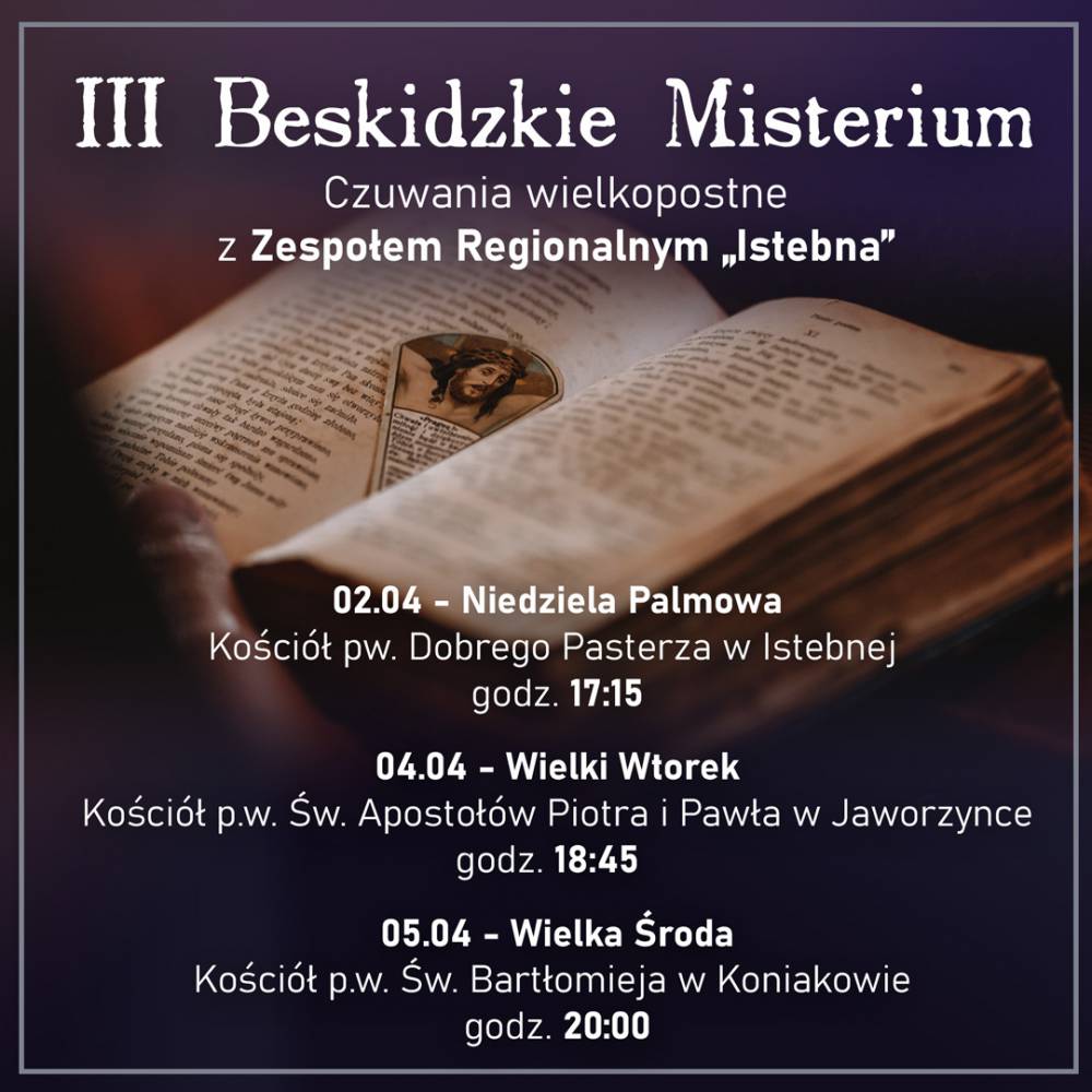 Zespół Regionalny Istebna zaprasza na III Beskidzkie Misterium - muzyczne czuwanie wielkopostne, podczas którego wysłuchamy najpiękniejszych utworów, których tematyką jest Męka Jezusa Chrystusa.