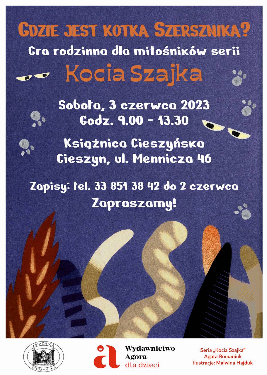 Gdzie się podziała kotka Szersznika? M.in. na takie pytanie będą odpowiadać uczestnicy rodzinnej gry, jaką z okazji Międzynarodowego Dnia Dziecka Książnica Cieszyńska przygotowała dla miłośników „Kociej Szajki”, przebojowej serii książek dla dzieci autorstwa Agaty Romaniuk. Do wspólnej zabawy Książnica Cieszyńska zaprasza dzieci wraz z dorosłymi w sobotę, 3 czerwca w godzinach od 9.00 do 13.30.