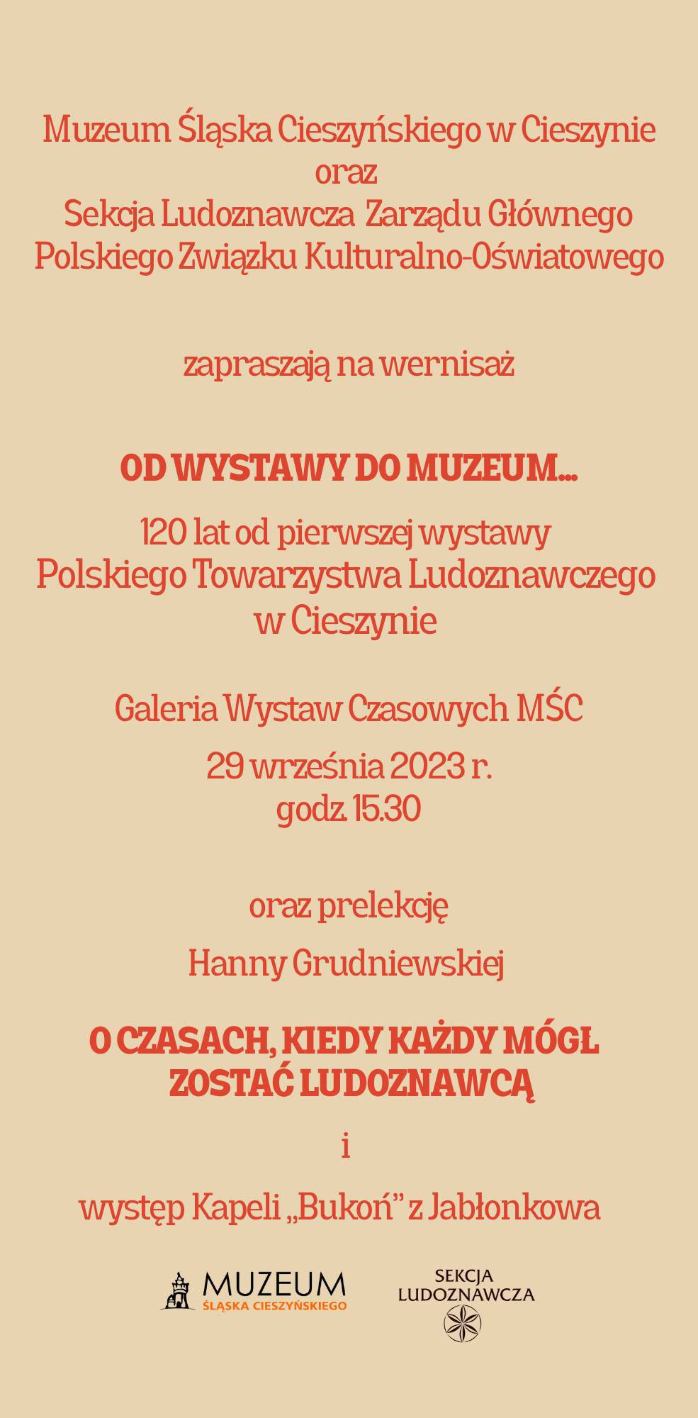 Serdecznie zapraszamy na uroczyste otwarcie wystawy: "OD WYSTAWY DO MUZEUM..." w dniu 29.09.2023 o godzinie 15.30 w Galerii Wystaw Czasowych, w Muzeum Śląska Cieszyńskiego w Cieszynie. W trakcie wernisażu odbędzie się prelekcja Hanny Grudniewskiej: "O CZASACH, KIEDY KAŻDY MÓGŁ ZOSTAĆ LUDOZNAWCĄ", wystapi także Kapela „Bukoń” z Jabłonkowa.