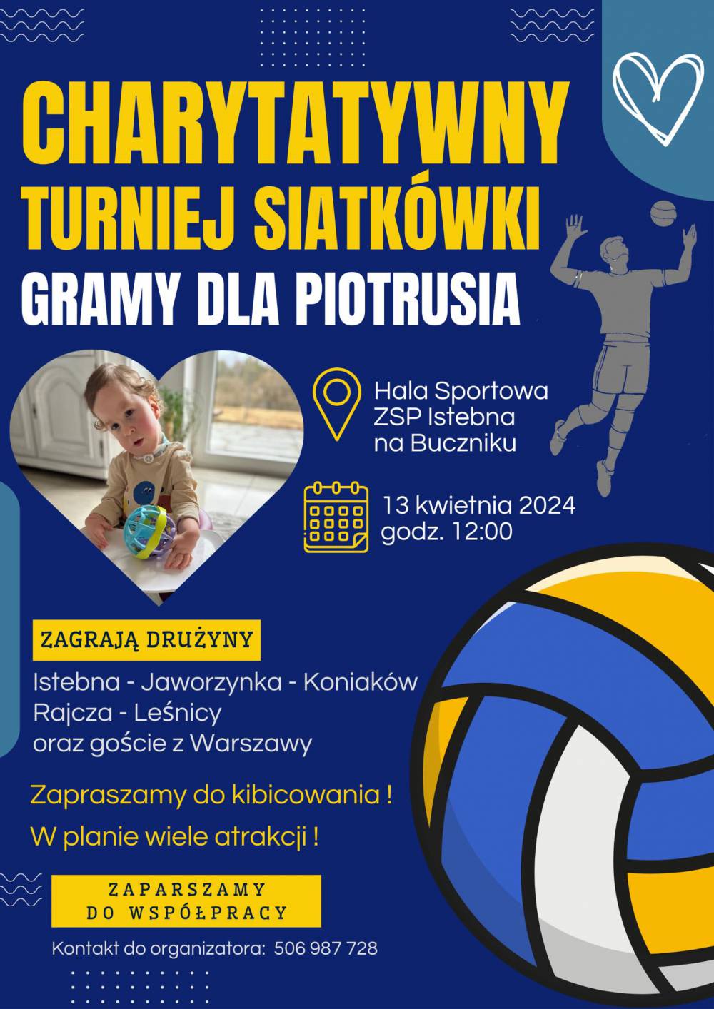 Zapraszamy wszystkich do kibicowania podczas 6 już charytatywnego turnieju w siatkówce, który odbędzie się 13.04.2024r od godz. 12:00 na hali sportowej dawnego gimnazjum w Istebnej.