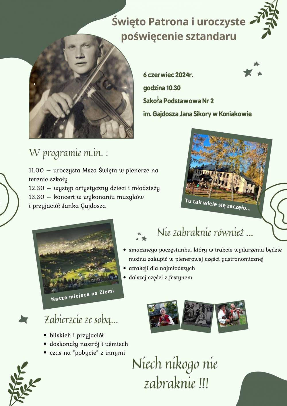 Szkoła Podstawowa Nr 2 im. Gajdosza Jana Sikory w Koniakowie zaprasza na Święto Patrona i uroczyste poświęcenie sztandaru, jakie odbędzie się 6 czerwca 2024 roku.
