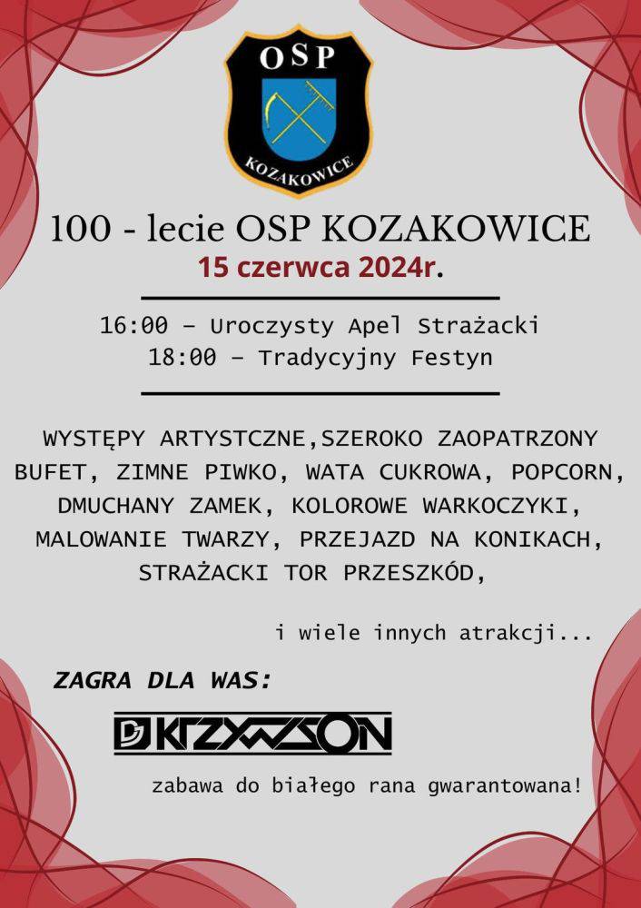 W sobotę, 15 czerwca świętowany będzie jubileusz 100-lecia jednostki Ochotniczej Straży Pożarnej w Kozakowicach. W programie uroczysty apel strażacki, w ramach którego nastąpi m.in. wręczenie proporca dla MDP Kozakowice, wręczenie odznaczeń i wyróżnień oraz defilada strażacka. Jubileuszowe wydarzenie obejmować będzie także tradycyjny festyn strażacki, podczas którego zagra DJ Krzywson. Początek wydarzenia o godz. 16.00 przy OSP w Kozakowicach. Festyn rozpocznie się o godz. 18.00.