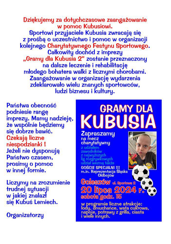 Sportowi przyjaciele Kubusia Lemiecha zapraszają na charytatywny mecz z udziałem zawodników z najwyższych lig rozgrywkowych oraz gości specjalnych, który odbędzie się w sobotę, 20 lipca o godz. 15.00 na boisku w Goleszowie. Oprócz meczu w programie liczne atrakcje, animacje oraz stoiska gastronomiczne. W imieniu organizatorów serdecznie zapraszamy.