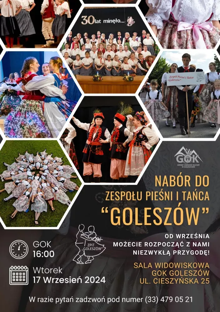 Zespół Pieśni i Tańca Goleszów ogłosił nabór nowych członków. Przygodę z tańcem i muzyką mogą rozpocząć wszyscy, niezależnie od wieku, którzy chcą się poruszać oraz mają mnóstwo energii, oraz kochają folklor. Przy okazji rozpoczętego naboru, Zespół Pieśni i Tańca Goleszów zaprasza na zajęcia pokazowe, które odbędą się we wtorek, 17 września o godz. 16.00 w sali widowiskowej Gminnego Ośrodka Kultury w Goleszowie.