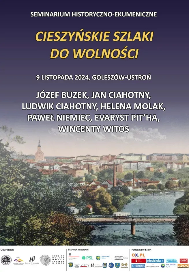 Fundacja Instytut Wyszehradzki, Chrześcijańskie Stowarzyszenie Ekumeniczne w Ustroniu, Towarzystwo Przyjaciół Muzeum Wincentego Witosa w Wierzchosławicach, Muzeum im. św. Jana Sarkandra w Skoczowie oraz rodzina Heleny Molak i Pawła Niemca zapraszają do udziału w seminarium historyczno-ekumenicznym zatytułowanym "Cieszyńskie szlaki do wolności", które będzie miało miejsce w Goleszowie i Ustroniu, w sobotę, 9 listopada.