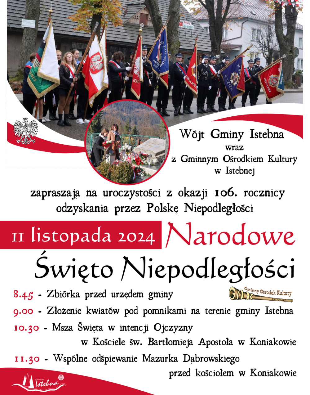 Wójt Gminy Istebna wraz z Gminnym Ośrodkiem Kultury w Istebnej serdecznie zapraszają do wspólnego świętowania 106. rocznicy odzyskania przez Polskę Niepodległości.