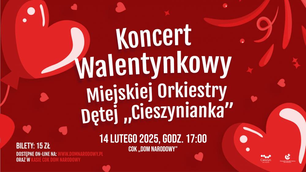 Cieszyński Ośrodek Kultury Dom Narodowy serdecznie zaprasza na wyjątkowy Koncert Walentynkowy, który wprowadzi Was w magiczny nastrój pełen miłości i muzycznych uniesień. W roli głównej Miejska Orkiestra Dęta Cieszynianka – zespół, który od lat zachwyca słuchaczy swoimi porywającymi aranżacjami i niezrównaną energią. Tym razem przygotowali dla Was wyjątkowy program, który idealnie wpisze się w romantyczny klimat Walentynek. Niech to będzie wieczór pełen pięknych dźwięków, niezapomnianych emocji i wspólnego celebrowania miłości – nie tylko tej romantycznej! Zapraszamy wszystkich miłośników muzyki i wyjątkowych chwil.