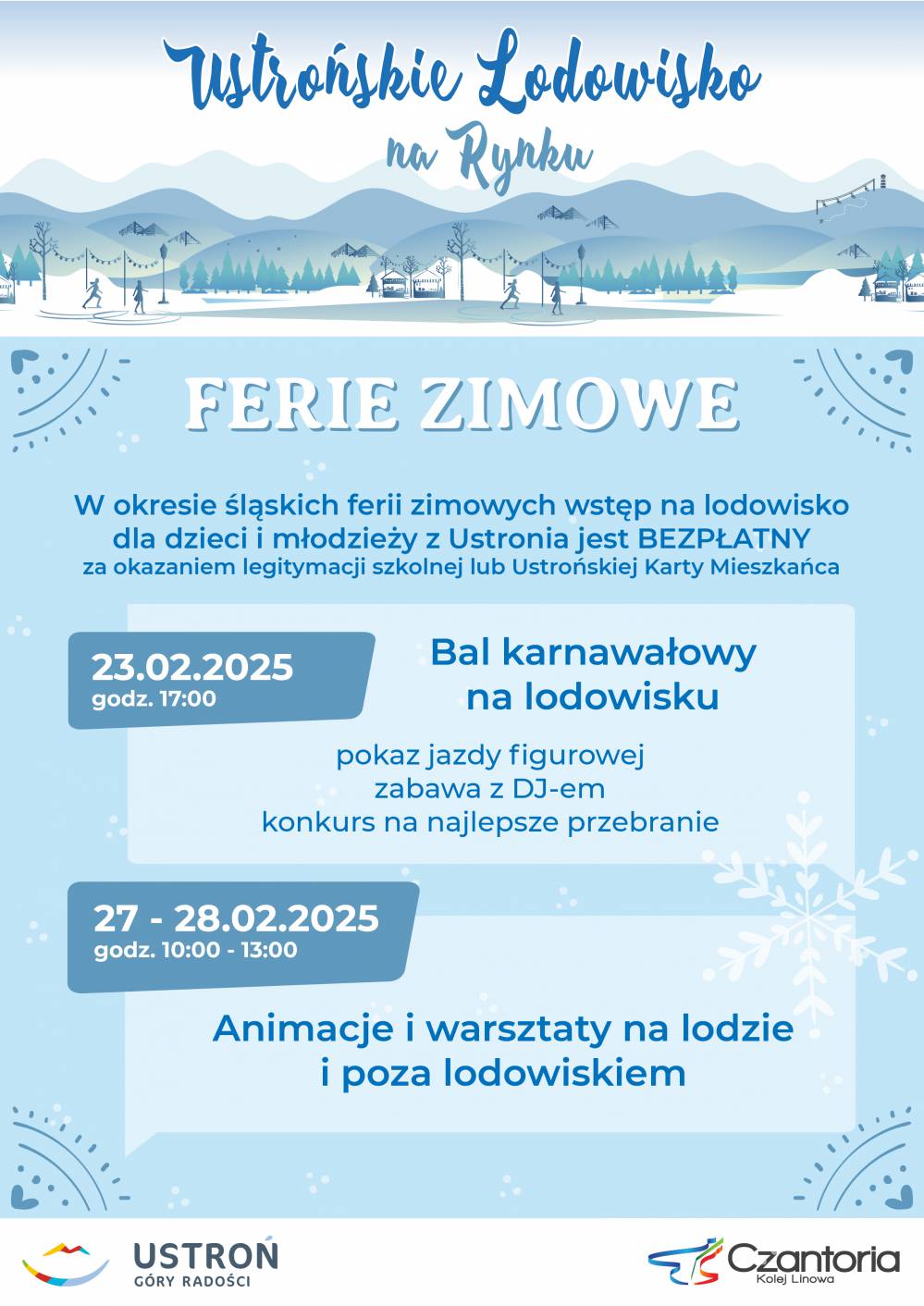 Zapraszamy do udziału w zabawach na lodowisku i poza lodowiskiem.Zajęcia odbędą sie 27 i 28 lutego w godz. 10:00-13:00 na Rynku w Ustroniu.