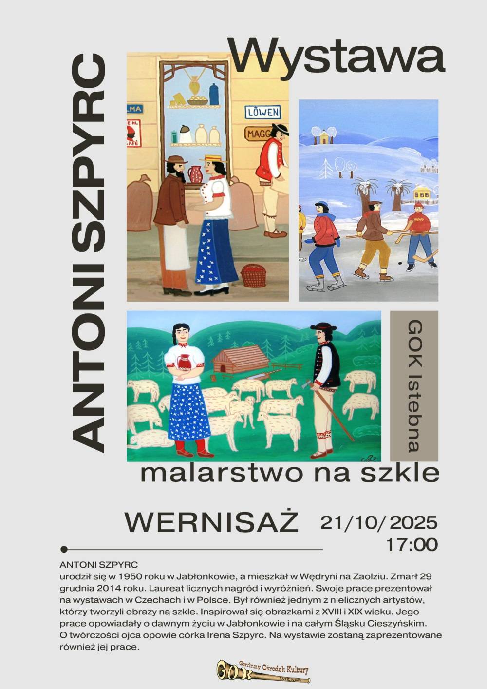Serdecznie zapraszamy na wyjątkowy wernisaż wystawy prac Antoniego Szpyrca – nieżyjącego już artysty z Jabłonkowa, jednego z nielicznych twórców malujących na szkle. Wydarzenie odbędzie się we wtorek, 21 października o godz. 17:00. w Gminnym Ośrodku Kultury w Istebnej.
