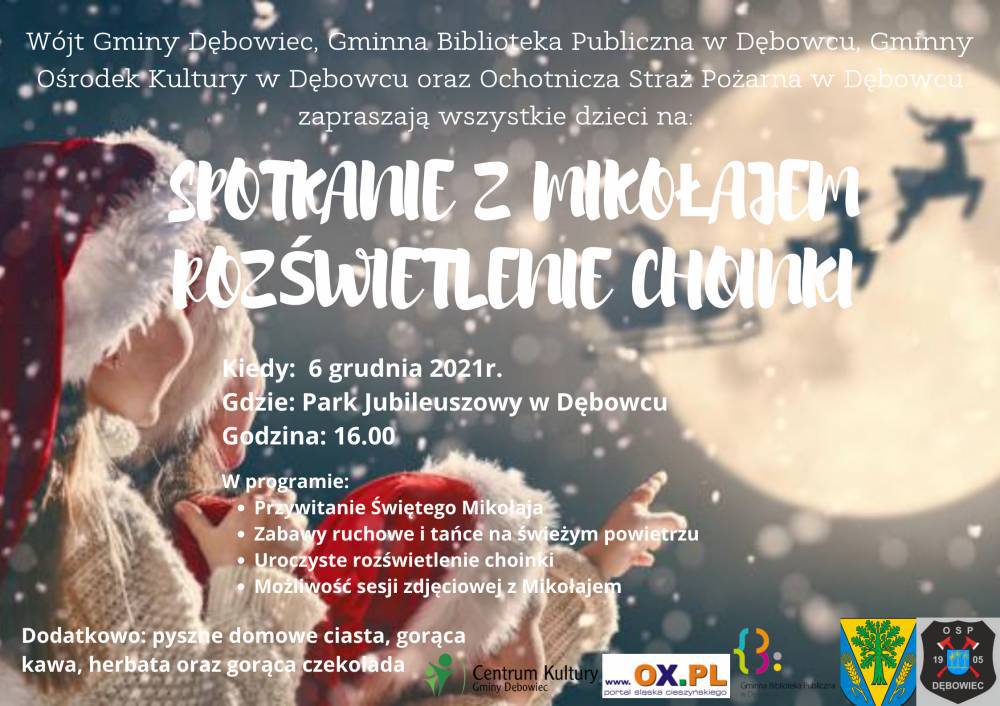 Wójt Gminy Dębowiec, Gminna Biblioteka Publiczna w Dębowcu, Gminny Ośrodek Kultury w Dębowcu oraz Ochotnicza Straż Pożarna w Dębowcu zapraszają wszystkie dzieci na Spotkanie z Mikołajem 6 grudnia 2021 w Parku Jubileuszowym w Dębowcu o 16:00