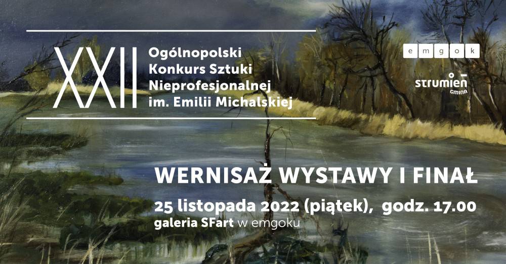 Miejsko-Gminny Ośrodek Kultury w Strumieniu zaprasza na wernisaż wystawy pokonkursowej i finał XXII Ogólnopolskiego Konkursu Sztuki Nieprofesjonalnej im. Emilii Michalskiej! Wydarzenie odbędzie się w piątek 25 listopada 2022 roku o godzinie 17.00 w Galerii Sfart w holu Miejsko-Gminnego Ośrodka Kultury w Strumieniu (ul. Młyńska 14). Podczas wydarzenia odbędzie się ogłoszenie wyników tegorocznej edycji konkursu oraz wręczenie nagród. Serdecznie zapraszamy wszystkich uczestników oraz zainteresowanych! Wystawa pokonkursowa będzie dostępna dla zwiedzających od 25 listopada do 30 grudnia 2022 r., w godzinach 8:00 – 20:00.