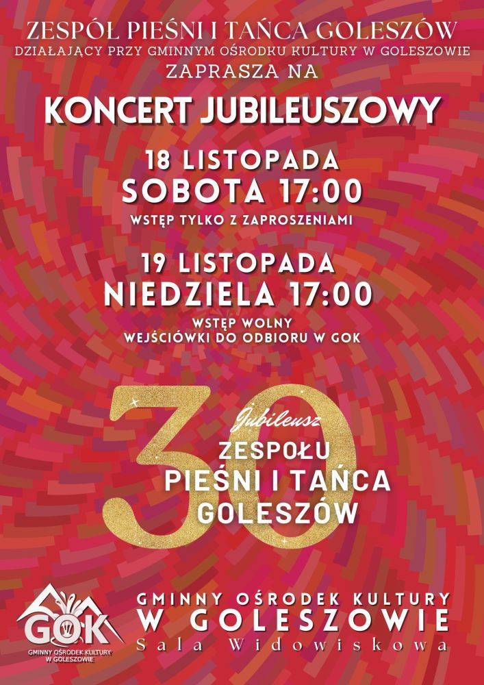 Zespół Pieśni i Tańca Goleszów zaprasza na jubileusz 30-lecia swojej działalności. W ramach koncertu zaprezentują się aktualni członkowie ZPiT Goleszów, jak również byli jego członkowie oraz uczestnicy projektu "Goleszów Tańczy", a więc dzieci i młodzież z gminnych przedszkoli i szkół. Występom towarzyszyć będzie kapela, w której gościnnie zagrają również byli muzycy zespołu. Szczegółowe informacje oraz wejściówki w sekretariacie Gminnego Ośrodka Kultury w Goleszowie.