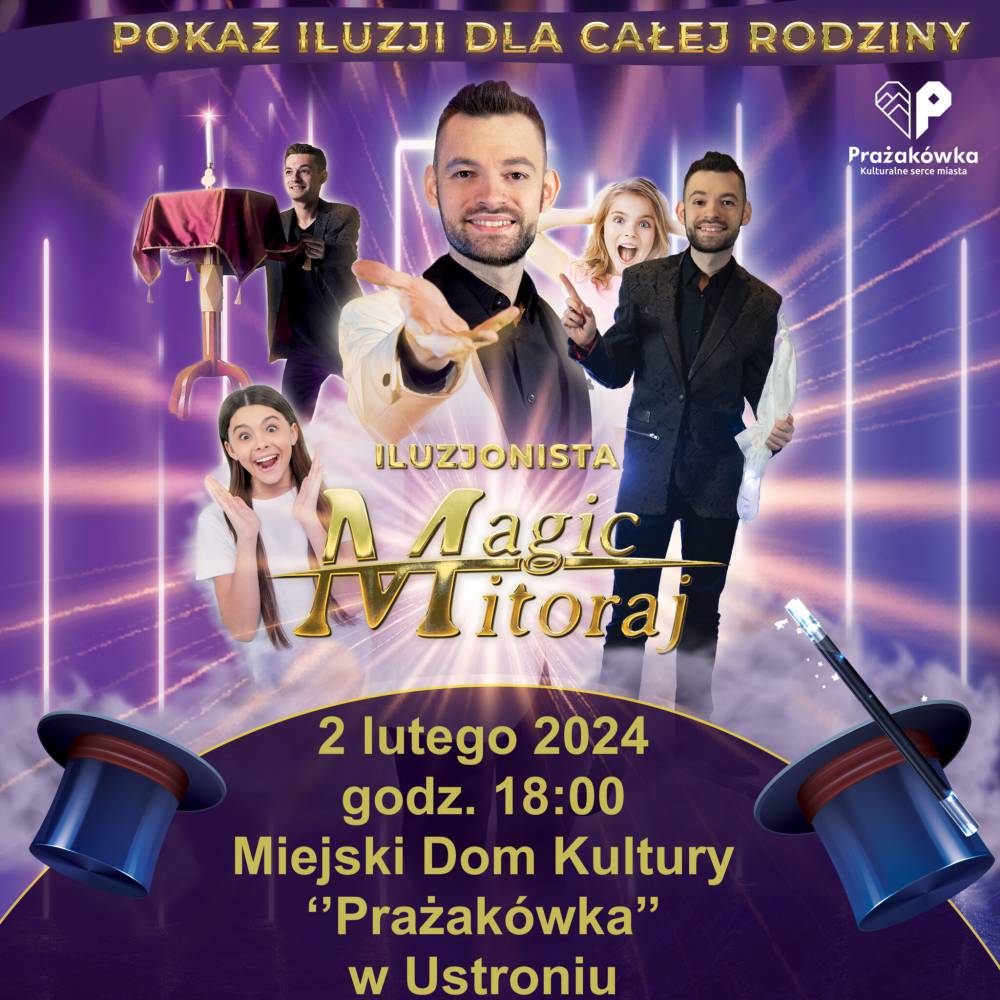 Magic Mitoraj, czyli Adrian Mitoraj to jeden z najlepszych iluzjonistów. Twórca spektakli iluzji dla największych parków rozrywki w Polsce. Wielokrotnie występował w Niemczech i Szwajcarii. Tym razem pojawi się w Twoim mieście! Podczas rodzinnego przedstawienia zobaczysz ponad 70 minut spektakularnych efektów z pogranicza dziecięcych marzeń. To show, które łączy pokolenia. Doskonała muzyka, gra aktorska. Wszystko po to, aby wprowadzić widzów w inny wymiar dostarczanej rozrywki. Interaktywne widowisko podczas, którego wszyscy czarują razem z prestidigitatorem. W programie będzie można zobaczyć: przenikanie ciała przez dziesięć stalowych obręczy, liczne lewitacje, taniec jedwabnej chusty, znikanie i pojawianie się przedmiotów oraz wiele innych niesamowitych sztuczek! Salwy śmiechu, emocje, duże iluzje. Opad szczęki gwarantowany! Pokaz zarówno dla dzieci i dorosłych. Wiek od 5 lat do 10000000000 lat.