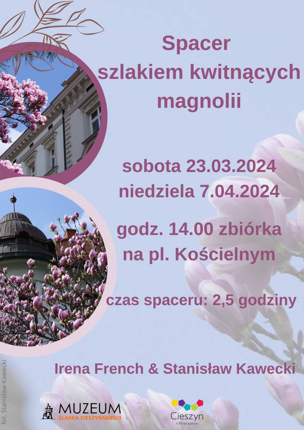 O kwitnących magnoliach opowiadał będzie Stanisław Kawecki, sekretarz Miasta Cieszyna, zaś o mijanych zakątkach Cieszyna i ich historiach opowie Irena French, dyrektorka Muzeum Śląska Cieszyńskiego.