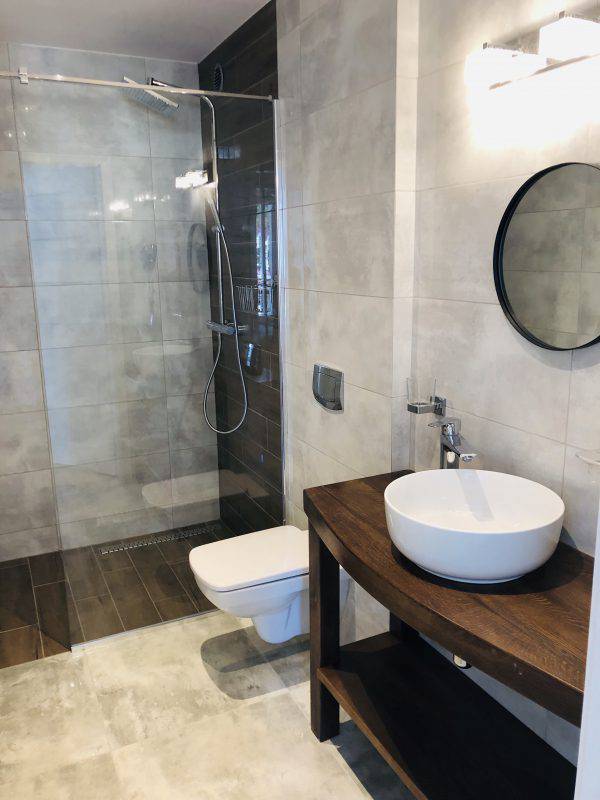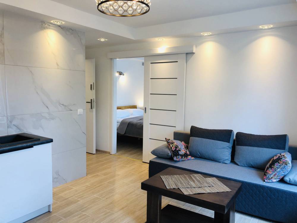 Apartamenty dwuosobowe wyposażone są w łózko małżeńskie , szafki nocne, lampki nocne , szafę, stolik oraz fotele.