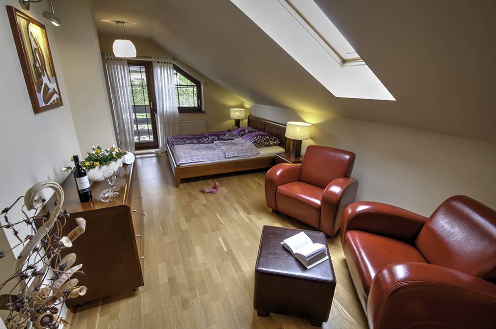 PIĘTRO - 60m2, 2 sypialnie: Suite Superior – łóżko małżeńskie (200/220) pokój z możliwością wyjścia na balkon i z widokiem na ogród.