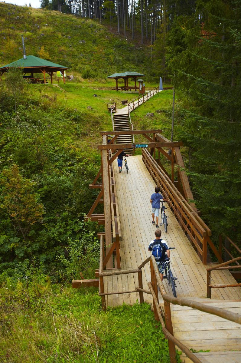Rowerzyści na nie istniejącym już od trzech lat mostku na słowacką stronę trójstyku (ma być odbudowany), foto Tomasz Renk, www.slaskie.travel