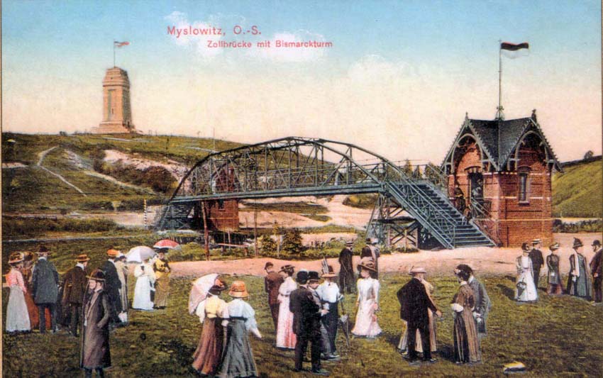 Wieża Bismarcka (proj. E. i G. Zillmannów) po mysłowickiej (niemieckiej) stronie Tójkąta Trzech Cesarzy, pocztówka ze zbiorów Stanisława Czekalskiego