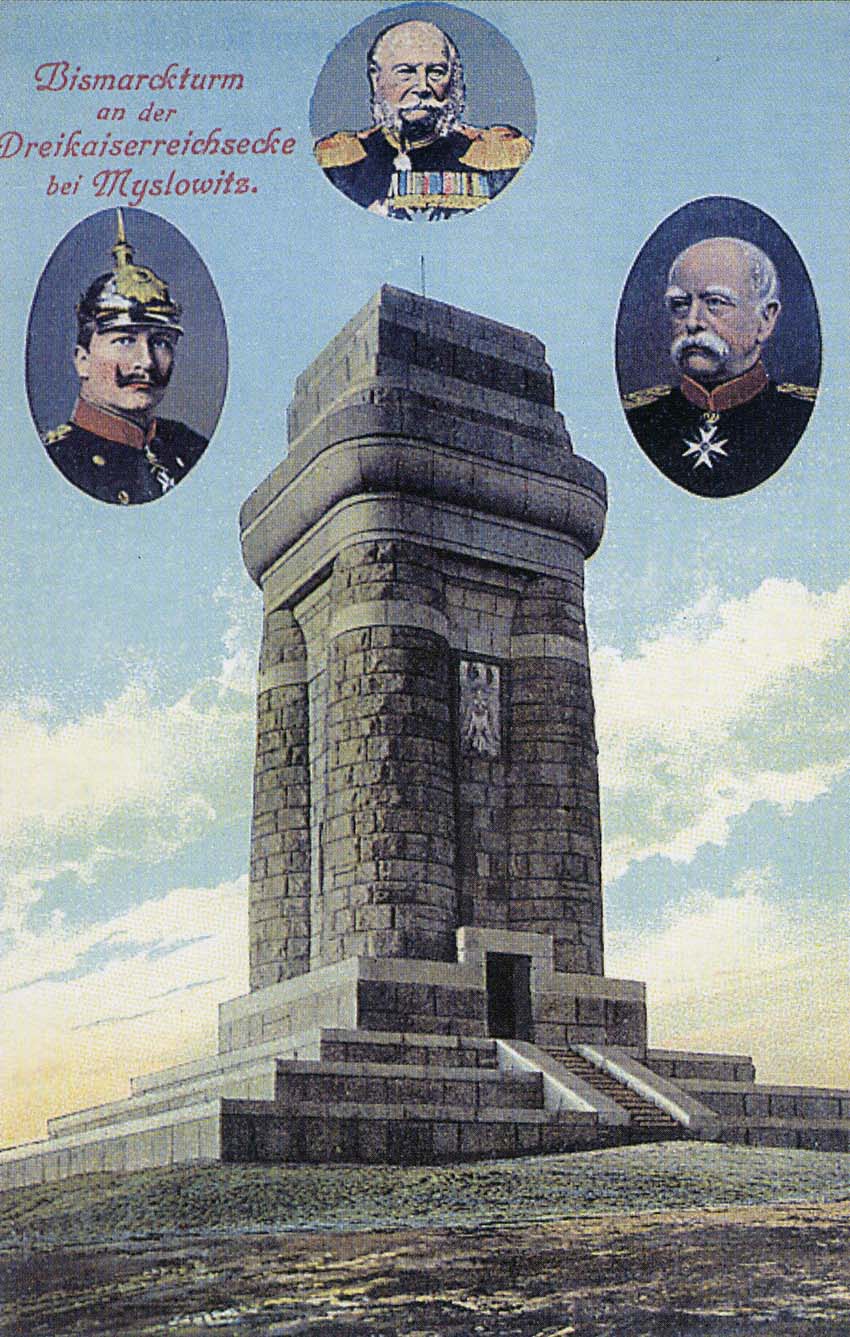 Trójkąt Trzech Cesarzy z Wieżą Bismarcka na starej pocztówce, zbiory Stanisława Czekalskiego