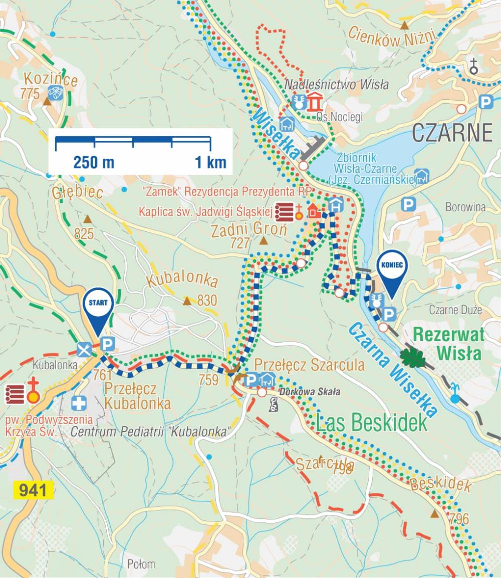 TRASA PRZEBIEGA DROGAMI ASFALTOWYMI. Spacer rozpoczynamy na PRZEŁĘCZY KUBALONKA (761 m n.p.m.). Znajdują się tutaj liczne punkty gastronomiczne, sklepiki z pamiątkami i parking. Podążamy asfaltową drogą wzdłuż czerwonego Głównego Szlaku Beskidzkiego. Po kilometrze marszu dochodzimy do PRZEŁĘCZY SZARCULA (763 m n.p.m.), na której mieści się leśny parking. Idąc dalej asfaltem wyraźnie obniżającą się drogą, dochodzimy do parkingu przy REZYDENCJI PREZYDENTA RP ZAMEK W WIŚLE – NARODOWYM ZESPOLE ZABYTKOWYM (od Kubalonki 2,6 km, 1,30 h). Na REZYDENCJĘ PREZYDENTA RP – składają się następujące obiekty: Zamek – historyczna rezydencja Prezydenta RP Ignacego Mościckiego, drewniana zabytkowa kaplica z 1909 r. oraz Zamek Dolny wraz z Gajówką. W kaplicy odbywają się w niedziele i święta ogólnodostępne msze św. (godz. 12.00) oraz nabożeństwa ewangelickie (godz. 10.30). 300 m niżej w ogólnodostępnym ZAMKU DOLNYM I GAJÓWCE, turyści indywidualni mogą przez cały rok korzystać z bazy noclegowej oraz oferty gastronomicznej rezydencji. Stąd możemy zejść do DOLINY CZARNEJ WISEŁKI, gdzie, za LEŚNICZÓWKĄ „PRZYSŁUP”, jest spory parking, dostosowany dla autokarów. Do tego miejsca odcinek pieszy wynosi 3,8 km. Jeżeli zostawiliśmy samochód na Przełęczy Kubalonka, musimy wrócić tą samą trasą. Obiekty Rezydencji Prezydenta RP są dostępne dla wózkowiczów; wejście do kaplicy po pokonaniu 3 schodów.