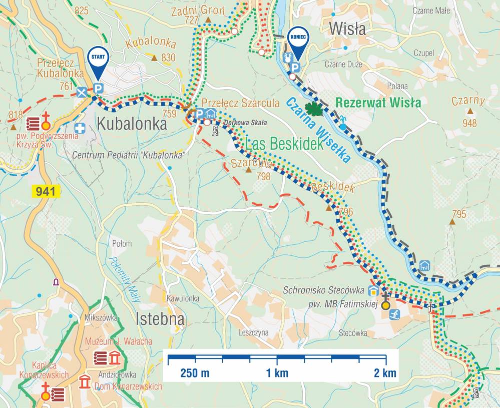 Ze Stecówki idziemy czerwonym szlakiem jeszcze 500 m, do rozwidlenia dróg. Wybieramy wariant w lewo, drogą asfaltową, jednak bez znaków szlaku turystycznego. Wędrujemy ok. 650 m trasą obniżającą się do DOLINY CZARNEJ WISEŁKI. Po przekroczeniu mostu na Czarnej Wisełce skręcamy w prawo i po 3 km dochodzimy do parkingu przy leśniczówce Przysłup. Tutaj kończymy wycieczkę, jeśli czeka na nas samochód, ale jeśli nasz samochód został na Kubalonce, musimy wrócić tą samą trasą albo skorzystać z komunikacji publicznej: 500 m dalej znajduje się przystanek Wisła Czarne (brak bezpośrednich połączeń z Kubalonką).