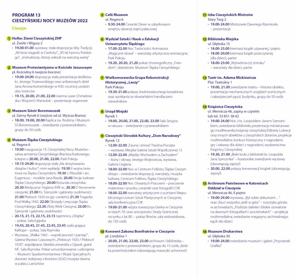 19.15-24.00 ekspozycja stała „Na skrzyżowaniu dziejów i kultur”; mini-wykłady: 19.30 II wojna światowa na Śląsku Cieszyńskim; 19.30 J. Piłsudski i arc. Eugeniusz – modele Jana Raszki; 20.00 Stroje ludowe Śląska Cieszyńskiego; 20.00 Rotunda cieszyńska; 20.30 Medycyna i higiena XVIII w.; 20.30 O fenomenie cieszynki; 21.00 Ks. Szersznik i gabinety osobliwości; 21.00 Plebiscit 1920 (w jęz. czeskim) 21.30 Tragedia Pod Wałką 1942; 22.00 Obrzędy i zwyczaje Śląska Cieszyńskiego; 22.30 Złoty Wiek Cieszyna; 23.00 Ks. Szersznik i gabinety osobliwości
