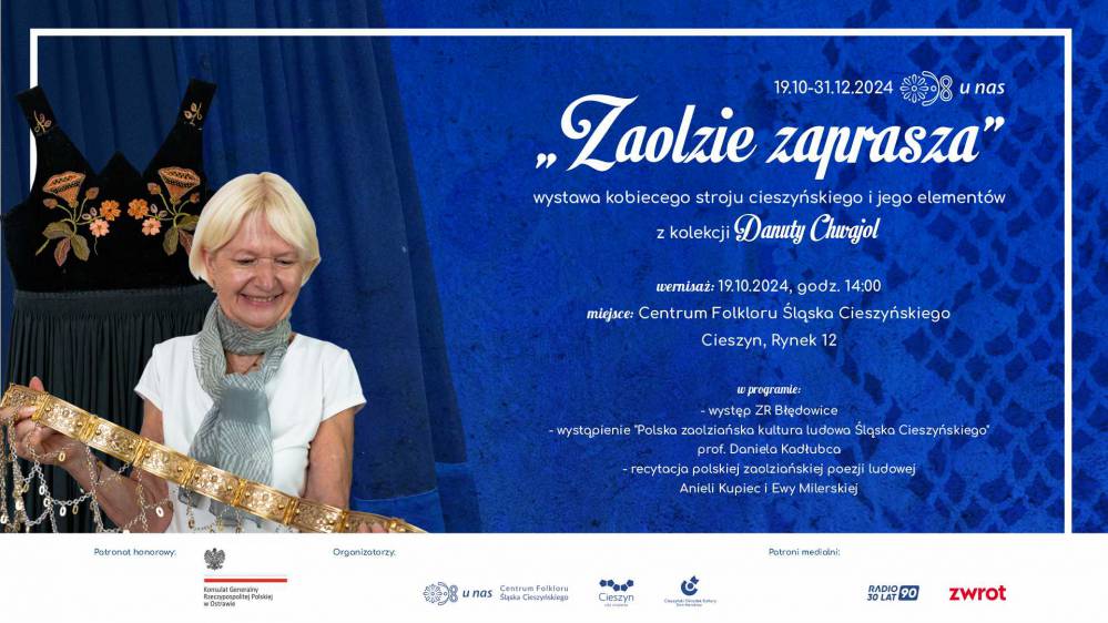 Cieszyński Ośrodek Kultury "Dom Narodowy" zaprasza na wystawę kobiecego stroju cieszyńskiego i jego elementów z kolekcji Danuty Chwajol. Otwarcie wystawy "Zaolzie zaprasza" i jej wernisaż odbędzie się w sobotę, 19 października o godzinie 14:00 w Centrum Folkloru Śląska Cieszyńskiego na drugim piętrze Domu Narodowego w Cieszynie. Ekspozycja będzie dostępna dla zwiedzających do 31 grudnia 2024, w godzinach pracy Ośrodka Kultury.