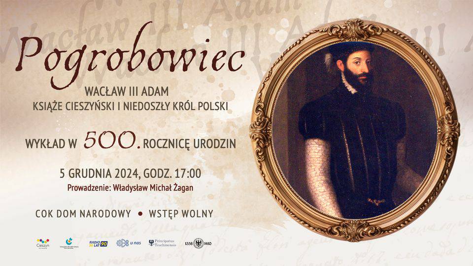 Cieszyński Ośrodek Kultury "Dom Narodowy" zaprasza na wyjątkowy wykład z okazji 500. rocznicy urodzin Księcia Cieszyńskiego Wacława III Adama. Prelekcję pr. "POGROBOWIEC" przedstawi Władysław Michał Żagan. Wydarzenie odbędzie się w czwartek 5 grudnia o godzinie 17:00 w Domu Narodowym w Cieszynie.