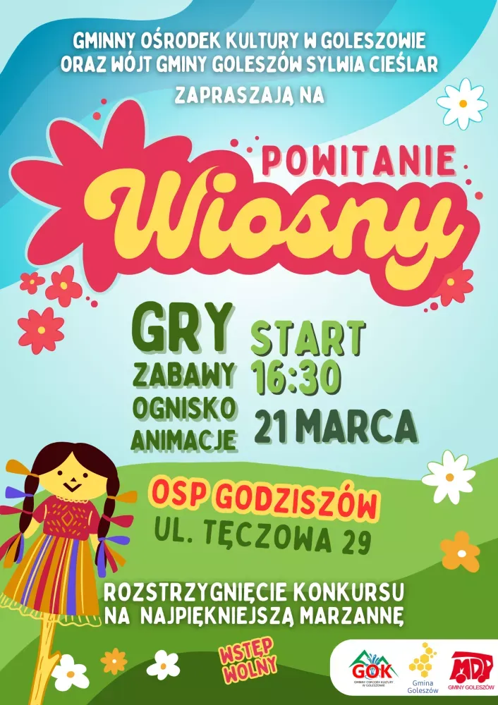 Gminny Ośrodek Kultury w Goleszowie oraz Wójt Gminy Goleszów Sylwia Cieślar zapraszają na Powitanie Wiosny, które odbędzie się na terenie jednostki OSP w Godziszowie przy ul. Tęczowej 29. W programie gry, zabawy, ognisko oraz animacje. Wydarzenia odbędzie się w piątek, 21 marca o godz. 16.30. W trakcie wydarzenia nastąpi także rozstrzygnięcie Konkursu na Najpiękniejszą Marzannę.