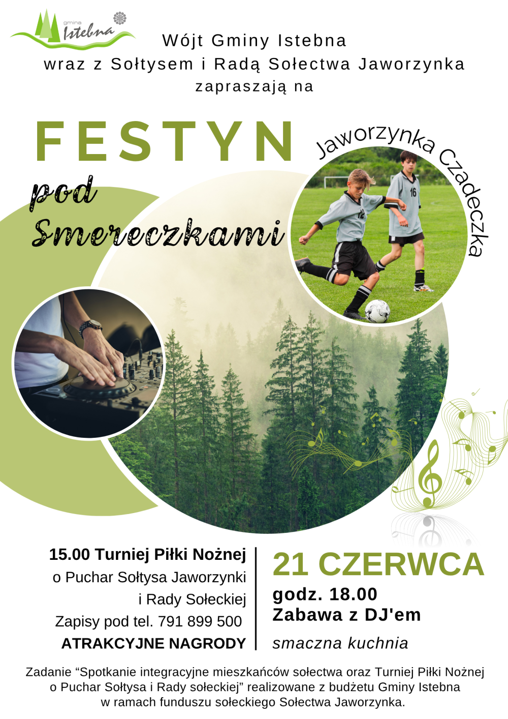 Wójt Gminy Istebna wraz z Sołtysem Sołectwa Jaworzynka oraz Radą Sołecką zapraszają na Spotkanie integracyjne mieszkańców sołectwa oraz Turniej Piłki Nożnej o Puchar Sołtysa i Rady sołeckiej w sobotę 21 czerwca 2025 w Jaworzynce Czadeczce o godz. 15.00.