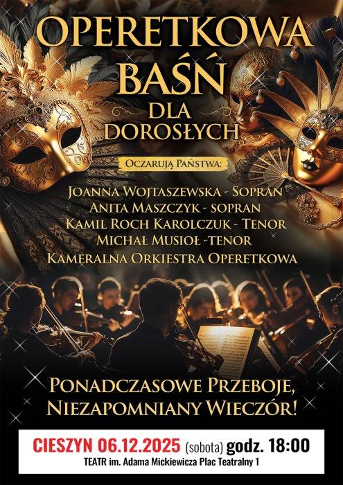 Drogie Panie, Szanowni Panowie - zapraszamy Was do świata, w którym muzyka uwodzi, zmysły tańczą, a rzeczywistość na chwilę ustępuje miejsca baśni. zapraszamy na koncert "OPERETKOWA BAŚŃ DLA DOROSŁYCH". który odbędzie się 06 grudnia 2025, o godzinie 18:00 w Teatrze im. Adama Mickiewicza w Cieszynie.