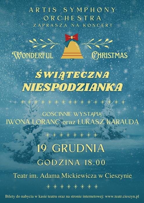 Zapraszamy na koncert „Świąteczna niespodzianka” - Wonderful Christmas  w wykonaniu Artis Symphony Orchestra, który w całości będzie niespodzianką. Koncert odbędzie się 19 grudnia 2025 w Teatrze im. Adama Mickiewicza w Cieszynie.