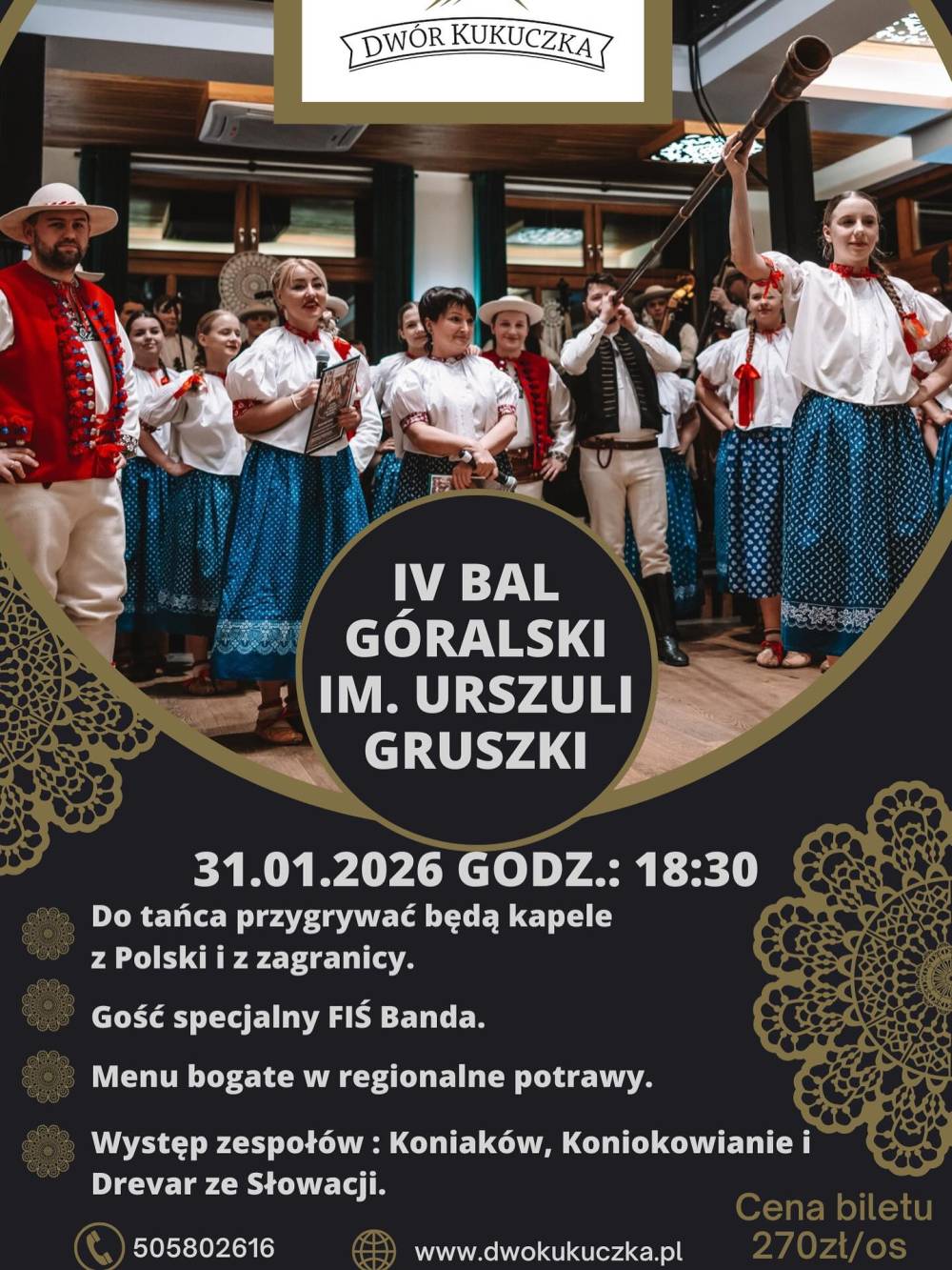 Zapraszamy serdecznie na wyjątkowe wydarzenie pełne tradycji, muzyki i wspomnień – IV Bal Góralski im. Urszuli Gruszki, który odbędzie się 31 stycznia 2026 roku o godz. 18:30 w Dworze Kukuczka w Istebnej.