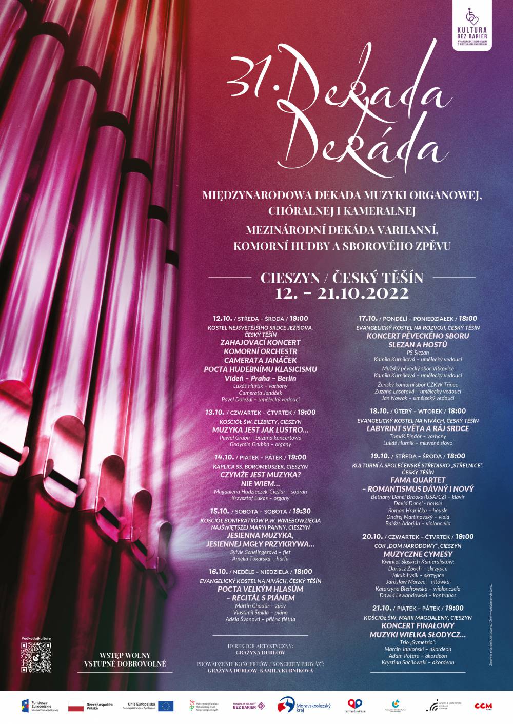 Jak co roku, jesienią, w Cieszynie i Czeskim Cieszynie rozbrzmiewa muzyka wszystkich epok. W tym roku po raz trzydziesty pierwszy publiczność po obu stronach Olzy, w zabytkowych wnętrzach kościołów, raczyć się będzie dziełami klasyków i kompozytorów współczesnych. Wystąpią znakomici muzycy, zespoły kameralne z Polski i Czech. Zapraszając serdecznie na dekadowe koncerty, mamy nadzieję, iż okażą się one inspirujące dla artystów, słuchaczom zaś dostarczą wielu muzycznych przeżyć i wzruszeń – piszą organizatorzy wydarzenia.