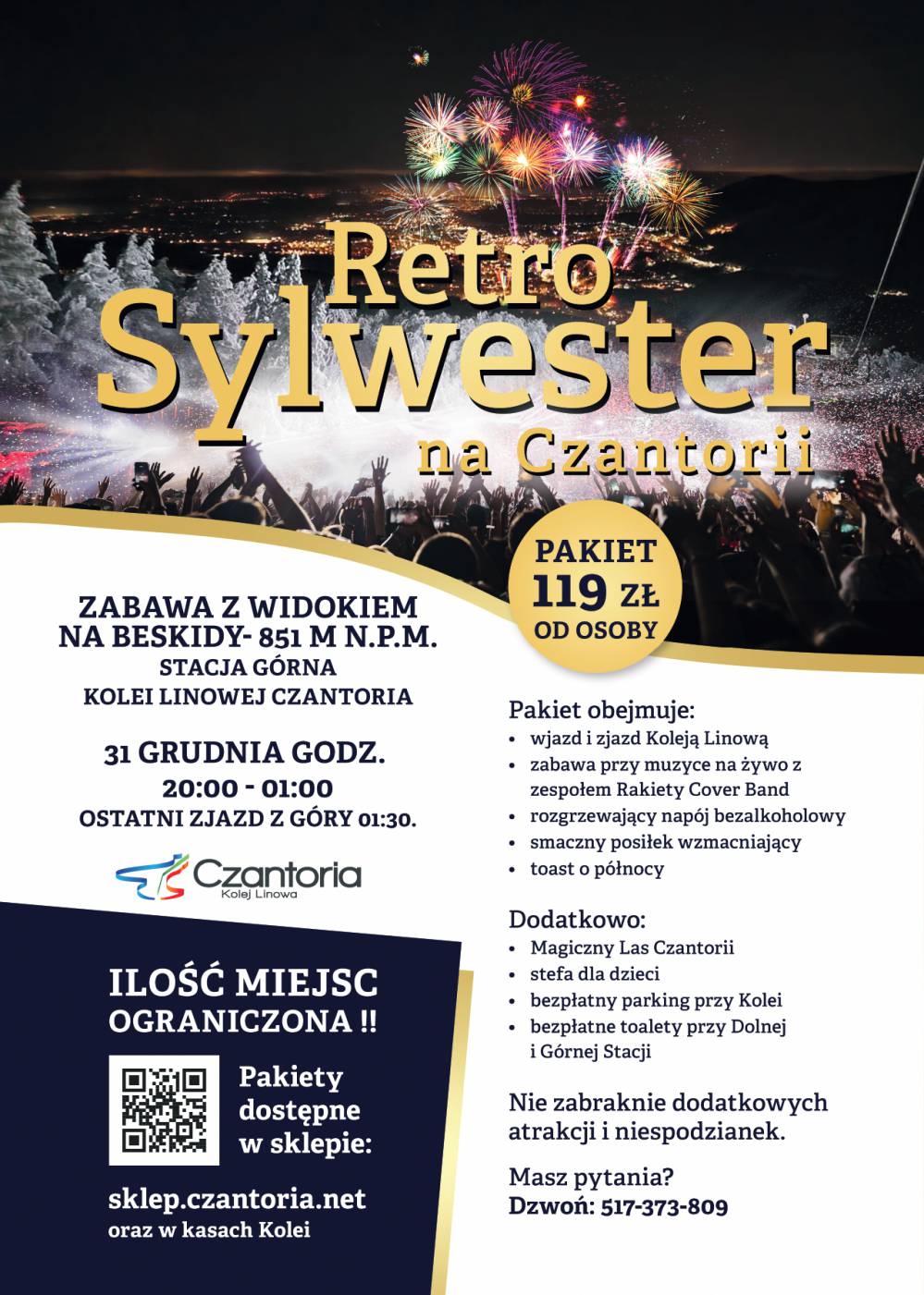 Po 7 latach powraca Kultowy Retro Sylwester na Czantorii! Wysoko ponad miastami, z muzyką na żywo, tańcem i widokiem na fajerwerkowy, noworoczny spektakl miast widocznych z polan Czantorii - to Retro Sylwester na Czantorii! Jeśli ktoś nie ma jeszcze sylwestrowych planów albo waha się, którą propozycję wybrać, ta przebije wszystkie!