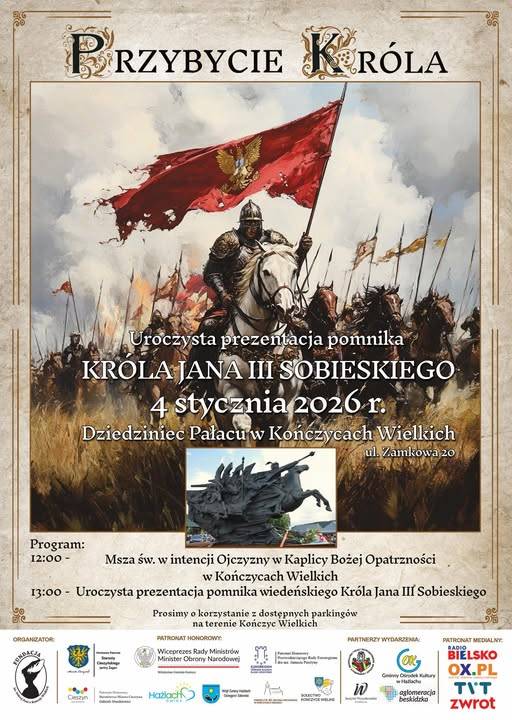 Z wielką radością zapraszamy na uroczystość odsłonięcia pomnika króla Jana III Sobieskiego, która odbędzie się 4 stycznia 2026 r. na dziedzińcu Pałacu w Kończycach Wielkich.