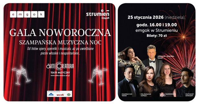 Rozpocznijmy wspólnie nowy rok! Miejsko-Gminny Ośrodek Kultury w Strumieniu (emgok), tradycyjnie już zaprasza na kolejną Galę Noworoczną.