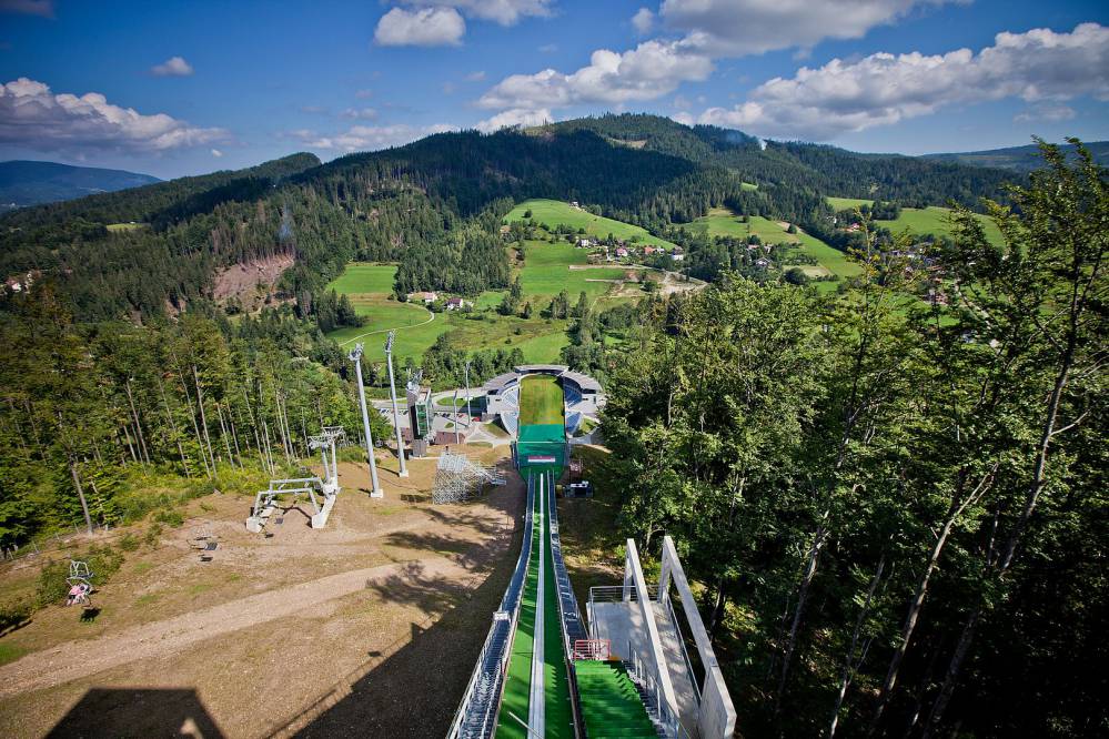 Wjeżdżamy koleją linową na Cieńków Niżni. Po wyjściu z peronu górnego skręcamy w prawo na wygodną ścieżkę prowadzącą grzbietem Cieńkowa w kierunku skoczni im. A. Małysza. (Skręcając w lewo, możemy zatrzymać się w jednym z dwóch punktów gastronomicznych, próbując regionalnych potraw). Na trasie usytuowana jest ścieżka edukacyjno-dydaktyczna z punktami przeznaczonymi do odpoczynku. Po przejściu ok. 1300m po prawej stronie pojawia się widok na wieżę startową skoczni. Skręcamy w prawo i na podstawie biletu zakupionego wcześniej w kasie kolei linowej wchodzimy na teren skoczni. W wieży startowej znajduje się kawiarenka i punkt widokowy. Rozciąga się z tego miejsca imponujący widok na rozbieg i zeskok skoczni. Zjeżdżamy koleją linową i zwiedzamy dolną część skoczni im. A. Małysza.