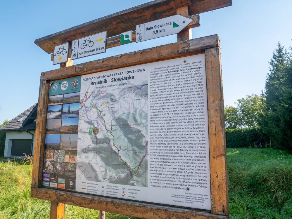 Żółty szlak rowerowy ma swój początek w Brzuśniku przy przystanku, a kończy się przy Górskiej Stacji Turystycznej Słowianka. Trasa liczy 8,5 km długości, ale jest bardzo trudna fizycznie i technicznie.